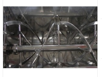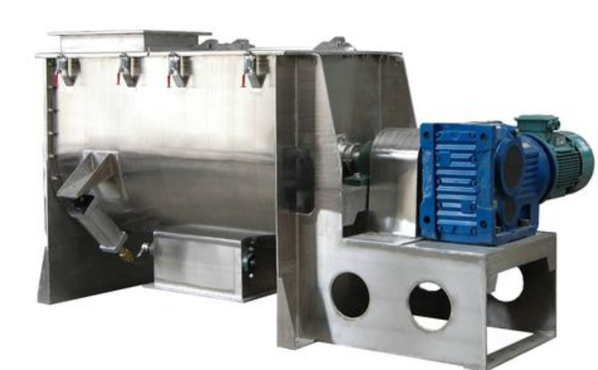 臥式螺帶混合機由傳動(dòng)部件、雙層螺條攪拌器、U形桶體組成。外螺條盤(pán)繞形式配合旋轉方向把物料從兩端向中間推動(dòng),而內螺條把物料從中間向兩端推動(dòng),螺帶不同的角度、方向繞法使物料產(chǎn)生不同的流動(dòng)方向,物料通過(guò)不斷的對流循環(huán),剪切摻混達到快速混合。