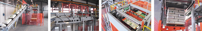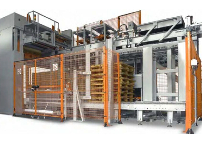 高位碼垛機將料袋輸送至需求高度后,按照預定方式對料袋進(jìn)行轉位、編組、推袋、分層、碼放,將料袋按層碼放到托盤(pán)上,后將碼好的滿(mǎn)垛輸出。