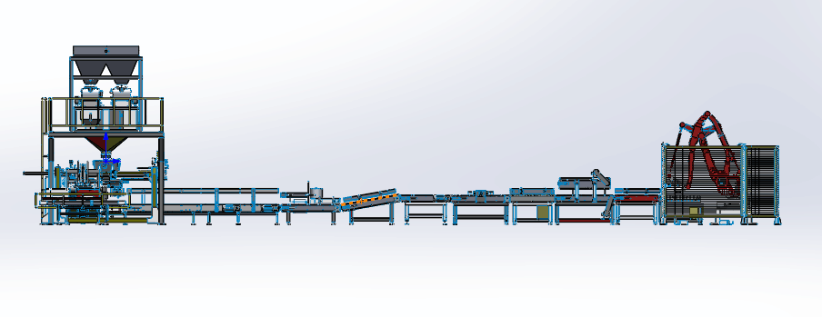 自動(dòng)供袋---自動(dòng)稱(chēng)重包裝---熱合縫包機---噴碼---輸送---倒袋整形機---金屬檢測機---重量復檢機---剔除---垛盤(pán)輸送---機械手碼垛---纏繞---出垛---AGV小車(chē)