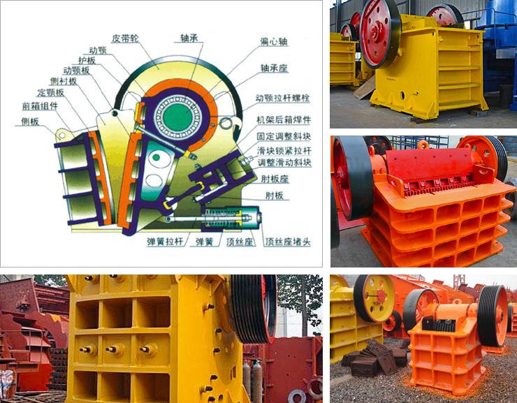 顎破的結構主要有機架、偏心軸、大皮帶輪、飛輪、動(dòng)顎、側護板、肘板、肘板后座、調隙螺桿、復位彈簧、固定顎板與活動(dòng)顎板等組成,其中肘板還起到保險作用。